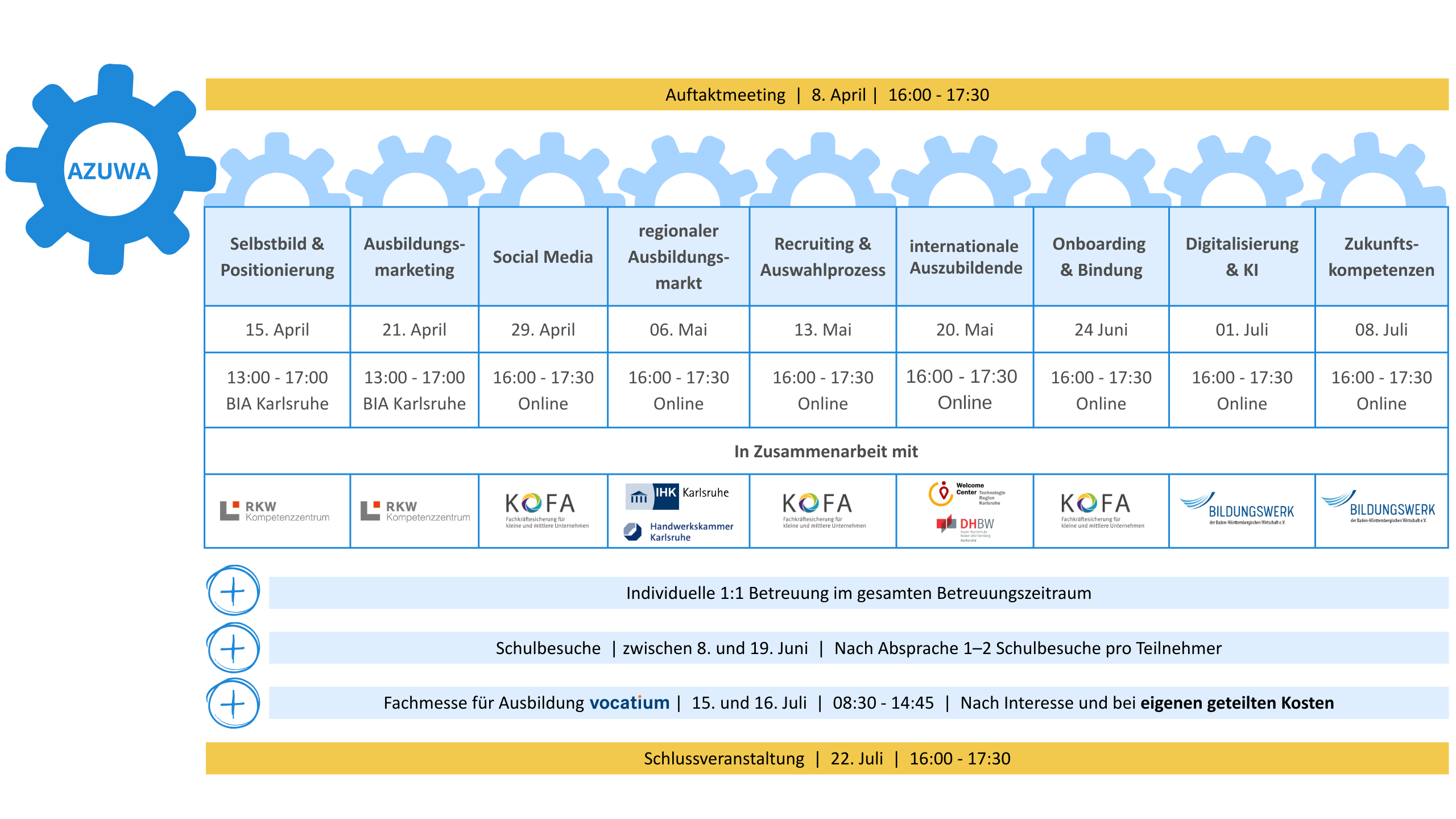 Während des kostenlosen Programms gibt es im Betreuungszeitraum Impulse, Seminare und Workshops für praxisnahe Strategien und Formate – verteilt auf vier Monate. Dabei behandeln wir Schritt für Schritt die zentralen Themen, die heute über die erfolgreiche Gewinnung von Azubis entscheiden.